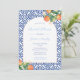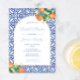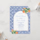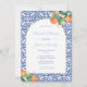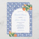 Esta é uma versão atualizada do meu design de Convite de festas Chá de panela de laranjas/azulejos azuis para apresentar uma forma de arco de tendência. O design inclui também laranjas aquáticas e folhas verdes brilhantes com azulejo azul e branco de cobalto.