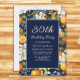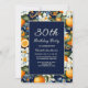 convite de festas aniversário de 30 anos decorado com laranjas e flores brancas sobre fundo azul marinho. Esses convites podem ser personalizados para qualquer um de qualquer idade. Entre em contato comigo para obter assistência com suas personalizações ou para solicitar outros produtos Zazzle correspondentes ou coordenadores para sua celebração.