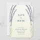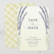 Este elegante casamento salva o cartão de data apresenta um fundo de gradiente amarelo claro com roxas de flores lavandas roxas em aquarela. O verso apresenta um fundo amarelo claro com padrões de verificação pintados à mão. Personalize-o para as suas necessidades. Você pode encontrar produtos correspondentes na minha loja.