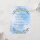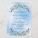 Céu branco e azul como fundo decorado com flores lavandas e verde de eucalipto. Personalize e seus nomes e detalhes. Voltar: adicione o URL do seu site de casamento ao código QR para obter mais detalhes e/ou RSVP