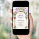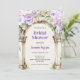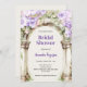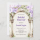 Um Chá de panela romântico. Um grande arco de mármore decorado com lavandas coloridas e flores cor-de-rosa. Personalize e adicione um nome e detalhes da parte.