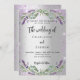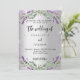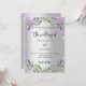 Um convite de casamento moderno e na moda. Um fundo de aparência pura prateada com brilho violeta, faíscas, flores de lavanda, flores e verde de eucalipto. Personalize e adicione seus nomes e detalhes. Voltar: adicione o URL do seu local de casamento para o código QR e um texto.