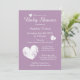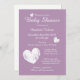 Lavanda elegante de chuveiro roxo e branco para garotas. A festa personalizada convida com pequenos corações brancos. Design neutro adequado para o menino e para a menina. Personalizar forma de recorte. Cor de fundo personalizada. i.e. aqua, amarela, azul ou rosa. Linda tipografia de na moda com símbolos de amor antigos. Modelo personalizável com RSVP e linha do registro. Cartões bonitos para mulheres grávidas / mãe para serem.
