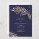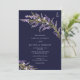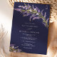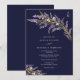 Clássica elegante de lavanda floral clássica, cor d'água de casamento com monogramas com galhos e flores de lavanda púrpura, folhagem verde e castanha e caligrafia elegante em azul marinho escuro.