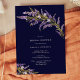 Um chá de panela clássico elegante de lavanda flutuante com aquarelas, com ramos e flores de caules botânicos de lavanda roxa, folhagem verde e castanha e caligrafia elegante em azul lavanda escuro.