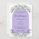 Um fundo branco decorado com flores lavandas, verde de eucalipto e armação de arco. Personalize e seus nomes e detalhes. Voltar: Personalize e adicione sua foto