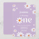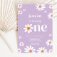 Lavanda Elegante, Retro Groovy Daisy Florals Convite primeiro aniversario. Convide seus convidados em estilo com a Lavanda Retro Groovy Daisy Florals Convite. A delicada sombra de lavanda, aliada a motivos de margarida retrorreflectores, cria um convite encantador e sofisticado, perfeito para a celebração do primeiro aniversário do seu filho. Personalize este convite elegante para destacar o seu evento.