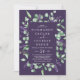 Este convite de casamento roxo de lavanda rústica para um casamento é perfeito para um casamento simples e elegante ao ar livre. O design floral apresenta folhas de cor aquosa de eucalipto e de verde, com espinhas roxas de flores silvestres sobre fundo roxo de ameixa.
