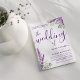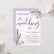 Um belo convite de casamento, com lavandas delicadas e eucaliputo pintados em aquarela. Caligrafia elegante em roxo. Arte original para você personalizar.