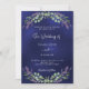 Um fundo azul marinho decorado com flores lavandas e verde de eucalipto. A cor azul é irregular. Personalize e seus nomes e detalhes. Voltar: adicione o URL do seu site de casamento ao código QR para obter detalhes e/ou RSVP.