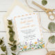 Flores silvestres, margaridas e folhas de lavanda em paleta de cor aquosa macia de marfim, lavanda, laranja verde e amarelo neste Chá de panela romântico e elegante de jardim. Este belo buquê e paleta colorida junto com um roteiro elegante de caligrafia que é perfeito para primavera, verão, jardim ou chás de panela ao ar livre.