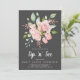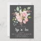 Um belo gole e veja um convite com uma grande disposição floral de cor d'água de rosas cor-de-rosa e verde, terminado com brilho rosado falso, sobre um sofisticado fundo de cinza escura. O inverso está em rosas claro sólidas. Fonte de estilo escrita com pincel moderno emparelhada com fonte sans serif dá a este convite uma aparência moderna.