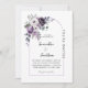 This wedding invitation features an elegant floral motif with soft purple, lavender, and white blooms accented by greenery in the top corner. A thin, curved purple border frames the text, which is centered and styled in a graceful serif font. The phrase “YOU’RE INVITED” runs vertically along the right edge, adding a modern touch. The layout is clean and formal, with the event details clearly presented and a note that a reception will follow. The overall design blends romantic charm with refined simplicity
