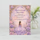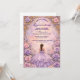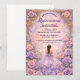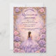This elegant quinceañera design features a dreamy lavender watercolor background framed by lush roses and ornate gold details, with a graceful gown illustration creating a soft fairytale atmosphere. The pastel purple palette, romantic florals, and refined composition give the design a luxurious yet youthful feel, perfect for a classic quinceañera celebration with an enchanted, elegant aesthetic.