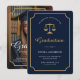 This law school graduation announcement features a scales of justice design paired with a gold ticket style border and a graduate photo set behind the layout. The navy and gold palette creates a formal legal theme suitable for announcing JD milestones.