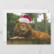 Leão majestoso vestindo um chapéu de Papai Noel vermelho e branco de Natal. Quero desejar-lhe um Natal rude!
