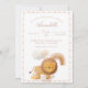Este convite de chá de fraldas personalizado apresenta uma ilustração bonita do estilo boêmico. Um pequeno leão é fotografado no fundo, em frente a um bonito arco-íris, nuvem e sol. Uma pilha de blocos para bebês é colocada na frente dela. Um quadro de corais cor-de-rosa macio borda o convite.