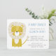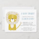 Um belo convite de chá com um leão com uma simples tipografia em azul e cinza. O reverso é coordenado em azul com bolinhas amarelas. Personalize todos os detalhes principais, incluindo nomes de pais, data, hora, local, RSVP e informações de registro.