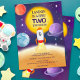 Celebre a órbita do segundo do seu pequeno astronauta com nossos convites de aniversário legal, com temas espaciais, com planetas, foguetes e estrelas! Pintado em aquarela em roxo, laranja, vermelho e amarelo. Ir para a lua!
