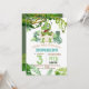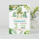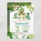 Um convite de festas de aniversário de 3 anos de dinossauros do mundo temático para uma festa do mundo jurássico. Um cartão na moda moderno com uma fonte em aquarela moderna que retrata dinossauros nos trópicos, verde floral. Aniversários de criança são especiais, e este convite pode ajudá-lo a fazer uma festa de aniversário memorável.