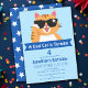 Celebre o dia especial do gato legal com o design de Aniversário desta Criança de Gato Legal. Este Convite apresenta um gato de mesa cor de laranja giro com óculos de sol contra um fundo pastel leve. O inverso é um padrão de estrelas brancas.