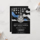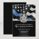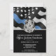 Este design apresenta uma bandeira de força policial com listras pretas e brancas e uma faixa fina azul também. O distintivo da polícia e o texto prateado ficam acima de todos os detalhes da festa para a aposentadoria do oficial de aplicação da lei, xerife, capitão ou chefe de polícia.