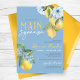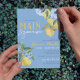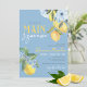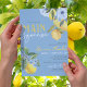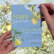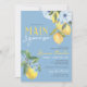 Elegante e Doce Derramado Chocando Azul-Cor-De-Água Ela Encontrou Seus Principais Convites De Refrigeração Com Limão. Apresentando lindas elegantes ardentes ardentes ardósias, flores azuis e limões amarelos doces. Disponível impresso com envelopes ou para download digital de alta resolução. Lado de trás azul semelhante, com limões e florais de cor aquosa mais impressionantes.