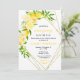 This fun and whimsical baby shower invitation features watercolor citrus lemons and foliage on a gold geometric frame. The text combines handwritten script and serif fonts for a stylish and modern look. This is perfect for a summer rustic baby shower.