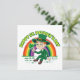 Convite com uma ilustração de um duende sorridente de desenho animado vestindo um terno verde e um chapéu-coco enquanto segura uma folha de trevo, com um arco-íris colorido ao fundo e texto dizendo "Feliz Dia de São Patrício"