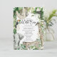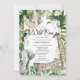 Um pouco selvagem na forma como o convite para chás de fraldas de safari por meio do gênero apresenta uma selva tropical com preguiça, macaco, girafa, elefante, tucano e leopardo. A parte de trás do convite mostra a impressão de fundo de leopardo com plantas tropicais e leões.