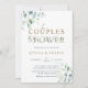 Este convite para chás de casamento apresenta cores aquáticas pintadas de eucalipto e folhas verdes com letras botânicas de verde e de ouro.