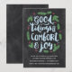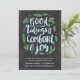 Este convite festivo para festas de festas apresenta um belo design de tipografia, com letra mão, que diz "Boas notícias de conforto e alegria" na caligrafia de pincel. Galhos de pinheiros verdes e bagas vermelhas ao redor do fosco, letras azuis claras. O design inclui um fundo do quadro de controle.