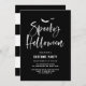 Letra Spooky Halloween Brush | Convite de festas de roupa. Convide a família e os amigos para a sua festa de Halloween com este convite de festa de Halloween preto e branco. Ele apresenta alfaces brancas de pincel, morcegos e listras de fundo. Outras cores estão disponíveis.