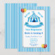 Este convite de aniversário apresenta uma tenda de circo azul e branca no Trabalho de arte de fundo da faixa azul por Grafos