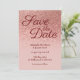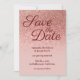 Rosa dourado falso foto brilhante com um borrão (sacudir a foto, se você quiser ver) com uma camada de ombre para o seu casamento, salve as datas. A letra decorativa vermelha-escura "Salvar a Data" é um estilo elegante de caligrafia contemporânea. As informações de nome e evento são exibidas em um estilo de fonte mais clássico. Rosa ouro e gradiente de brilho cor-de-rosa pastel. Diminuição falsa das datas.
