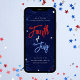 Celebrate America's Birthday with this fun and patriotic 4th of July backyard bbq party invitation with firework and stars on a dark blue background with red white and blue typography.