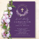 Lindos convites da Primeira Comunhão com uma coroa lilática lavanda e cruz sobre fundo roxo escuro. Sacudir nosso convite para ver uma coordenação de volta para um toque especial extra.