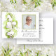 Convide os convidados a lembrar-se do seu amado, um ano depois da sua morte, com a elegante Lily do Vale Flowers, Convite de Aniversário da Morte. Esta celebração bonito e personalizada de flores do tributo memorial de vida convida a uma fotografia floral colorida de perto, pintada digitalmente, das flores brancas do Vale, sobre o caule, com um fundo verde-desfocado. Personalize-o com o nome, data de nascimento e morte e fotografia do falecido. Disponível como convite impresso para envio e/ou como download digital para fácil compartilhamento digital online.