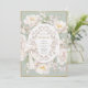 Lovely vintage romantic soft colors of lillies of the valley and peonies done in pinks and ivory shades. Perfect for any season wedding. All done on a sage green background with a faux gold rustic frame. Budget invitation with all your event details located on the reverse side of this lovely invitation.