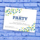 Este convite de festas colorido apresenta um confete colorido em tons de azul, verde, turquesa e limão.