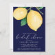 Um chá de panela clássico com limões aquosos e folhas verdes sobre fundo azul marinho. "chá de panela" está na letra branca do estilo caligrafia moderna. Personalizar com detalhes do evento em letra branca. O reverso apresenta um fundo azul marinho com um padrão de limões e folhas de aquarelas.