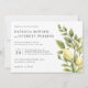 Convites de casamento botânico horizontal modernos e modernos, que incluem um ramo de limões e folhas numa sofisticada paleta de amarelos leves e verdes de azeitona. A cor de fundo inversa é definida para um amarelo pálido coordenado. Convite de casamento leve e arejado perfeito para o casamento de inspiração tuscana ou italiana ou para um casamento no campo.