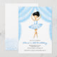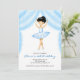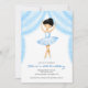 Convite temático de ballet fofo para menina. Ilustração de uma pequena bailarina morena de tutu azul em cores azul claro.