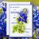 Uma fotografia única "de um tipo" de uma flor do Texas Bluebonnet com caule e folhas. Um fecho das pétalas azuis e um fundo macio que desaparece para branco com um quadro azul. Um design moderno do tipo na cor azul da flor. Preencha com suas informações de casamento na parte de trás deste conjunto único de convites para o casamento.