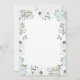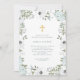 Estes adoráveis convites Baptism ou Christening apresentam uma elegante fronteira floral pintada com flores brancas, cinzas e azuis macios, e folhas botânicas verdes sobre fundo branco com uma cruz falsa de ouro.