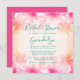 Belo modelo chá de panela de flores havaianas. Design de placa quadrada com script de mão de cinza escura para título de festa e nome da noiva. Adicione facilmente informações sobre a parte, registro e RSVP sobre um fundo de ouro rosa e amarelo com grandes flores de frangipani / plumeria no topo e no fundo. O reverso é cor-de-rosa escuro sólido. Outros tamanhos de convite estão disponíveis, como redondo ou 5x7. Nem todos os tamanhos funcionarão para este design.