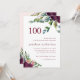 Linda e víbora aquática, botânica floral e verde, um centésimo convite de festas de celebração de aniversário, apresenta um belo rosa pastel de volta com flores roxas e arbustos verdes, e uma frente branca com elegante 100 tipografia e florescências com folhagem.