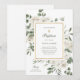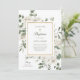 Estes belos convites Baptismos ou Christening apresentam um falso quadro de ouro rodeado por creme bonito e flores brancas e eucalipto verde e folhas. Há também uma cruz de ouro falsa correspondente, e um texto verde clássico sobre um fundo branco.