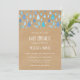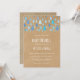 Gotas de chuva azuis caem em direção aos seus detalhes personalizados em um fundo rústico boho kraft, neste convite de sprinkle ou chá de bebê de casal fofo. O verso apresenta uma chuva adicional de gotas de chuva, adicionando um toque extra ao seu evento especial. Projetado por Thisisnotme©