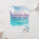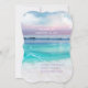 Céu rosa e lavanda ao nascer do sol com nuvens fofas, o nascer do sol começando a se refletir nas ondas do oceano. Coral bonito, ostra aberta com pérola dentro acentua este design de convite. Configuração de costa tropical sofisticada para aquele casamento de praia perfeito ou casamento em ilha de destino.